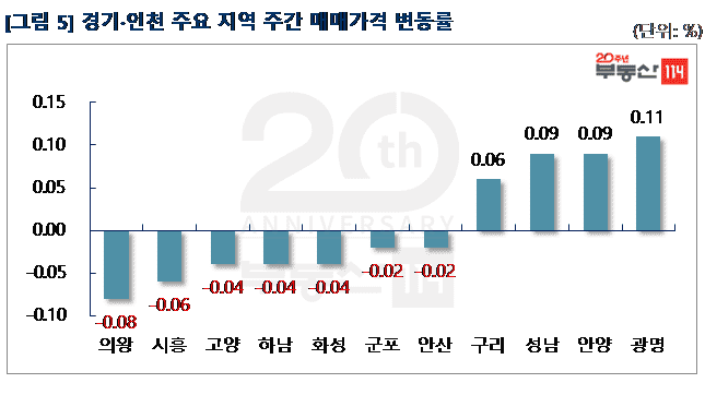 경기ㆍ인천은 ▼의왕(-0.08%) ▼시흥(-0.06%) ▼고양(-0.04%) ▼하남(-0.04%) ▼화성(-0.04%) 순으로 하락했다. 의왕은 거래절벽이 이어지면서 내손동 대원칸타빌2단지가 1,000만원 떨어졌다. 시흥은 정왕동 호반베르디움센트로하임이 1,000만원 하향 조정됐다. 고양은 비수기 영향으로 성사동 래미안휴레스트가 1,000만원-1,500만원 내렸다. 하남은 거래 부진으로 덕풍동 한솔리치빌2·3단지와 한솔솔파크가 500만원-1,000만원 떨어졌다. 반면 광명△(0.11%) △안양(0.09%) △성남(0.09%) △구리(0.06%)는 상승했다. 광명은 거래가 이뤄지면서 하안동 e편한세상센트레빌, 철산동 철산래미안자이가 각각 500만원 올랐다. 안양은 대단지 새 아파트인 래미안안양메가트리아가 500만원-1,000만원 상승했고, 성남은 신흥동 청구가 1,000만원 올랐다.