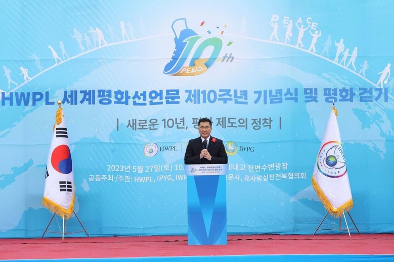 [세계타임즈 백진욱 기자] 지난27일(토) (사)하늘문화세계평화광복(HWPL, 대표 이만희)글로벌12지부가 전주시 삼천천 기접놀이전수관 앞 하천변에서 ‘HWPL 세계평화선언문 제10주년 기념식 및 평화 걷기’ 행사를 개최했다.