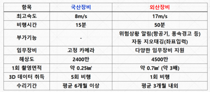 <국산·외산 드론 성능 비교표>