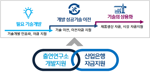 또한 기업이 출연연구소 보유 기술을 이전 받거나, 개발에 성공한 기술을 사업화 할 경우 대출과 투자가 복합된 산업은행의 맞춤형 금융상품을 제공하여, 기술성장의 전생애주기(기술개발-이전-사업화)에 걸쳐 기업-연구소-금융기관 간의 선순환 협력 시스템을 구축하게 된다.