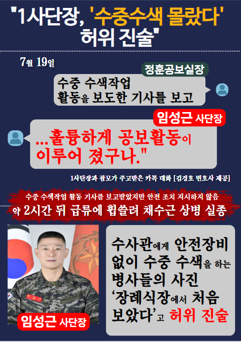 이와 관련하여 서영교 최고위원은 “ 수사단장이 수사를 하는 과정 속에서 문제를 밝혀내게 되었다 . 임성근 사단장이 ‘ 훌륭하게 공보활동이 이루어졌구나 .’ 하고 두 시간 뒤에 채수근 상병의 사고가 일어났는데 , 임성근 사단장은 ‘ 그렇게 수색하는지 몰랐다 . 안전장비 없이 수중 수색을 하는 병사들의 사진을 ‘ 장례식장에서 처음 보았다 ’ 고 거짓말을 했다 . 그 전에 카톡을 통해서 다 보고 받아놓고 , ‘ 그 내용은 장례식장에서나 알았다 ’ 라고 했으니 사단장은 수사대상이 된 것이다 .” 라고 강조했다 .