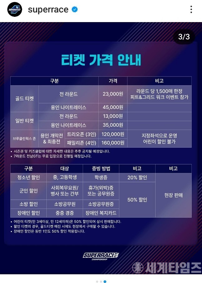 [세계타임즈=방춘재 기자] ㈜슈퍼레이스가 2025 슈퍼레이스 챔피언십 티켓을 정책을 3월 3일(월)에 공개했다.