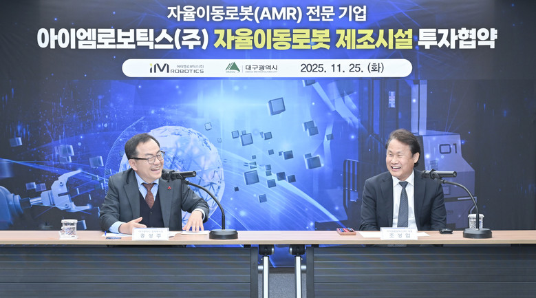 ▸ 국가로봇테스트필드, AI로봇 글로벌혁신특구와 연계 시너지 효과 기대 [세계타임즈=대구 한윤석 기자] 대구광역시는 11월 25일(화) 오후 3시, 시청 산격청사에서 아이엠로보틱스㈜(대표이사 조성엽)와 금호워터폴리스 내 ‘자율이동로봇(AMR, Autonomous Mobile Robot) 제조시설 건립’을 위한 투자협약을 체결했다.