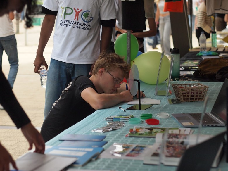 ▲지난달20일 네덜란드 로테르담 에라스무스 대학교에서 열린 유레카위크(Eureka Week) 신입생 오리엔테이션에 참여한 학생이 IPYG부스에서 평화 메세지를 적고 있다. [사진 제공 = IPYG]