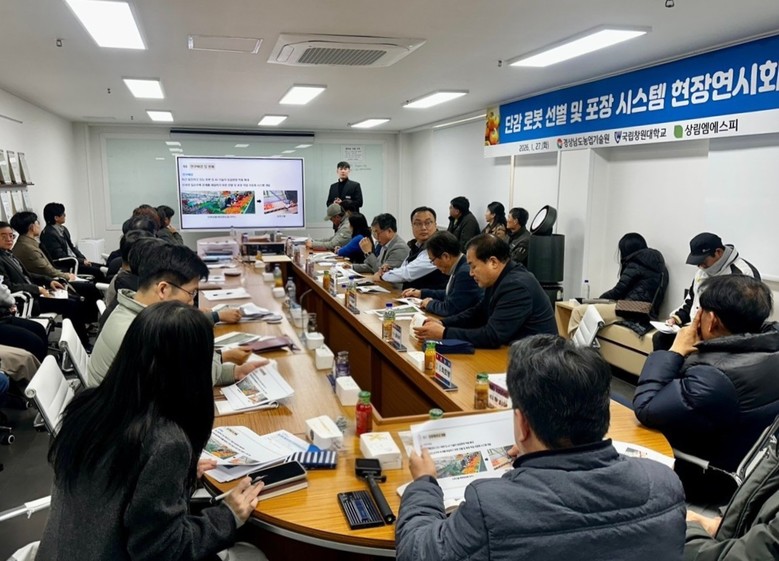 이번 연시회는 단감 선별·포장 공정 자동화 기술을 현장에서 시연하고, 현장 적용 가능성과 활용 방안을 논의하기 위해 마련됐다. 행사에는 관계 공무원, 개발업체, 창원대학교, 농협 관계자 등 40여 명이 참석했다.