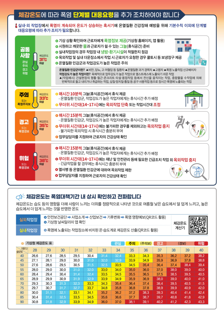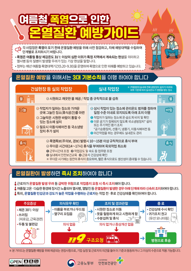 김철희 산업안전보건정책관은 “다음 주부터는(6.17.~9.13.) 건설현장을 포함하여 온열질환 예방조치 이행여부에 대한 대대적인 점검을 실시하겠다”라며, “사업장에서도 사업주와 근로자 모두 온열질환 예방 3대 기본수칙(물・그늘(바람)・휴식)과 단계별 대응조치 요령을 준수해 주실 것”을 당부했다