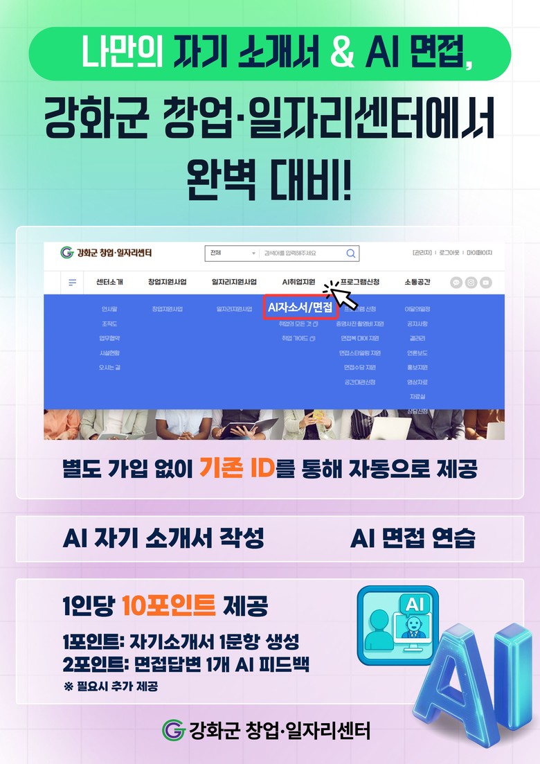 AI 취업 지원 서비스와 관련한 자세한 사항은 강화군 창업‧일자리센터 홈페이지(www.ganghwajob.kr)를 통해 확인하거나 유선(☎032-934-3098)으로 문의하면 된다.
