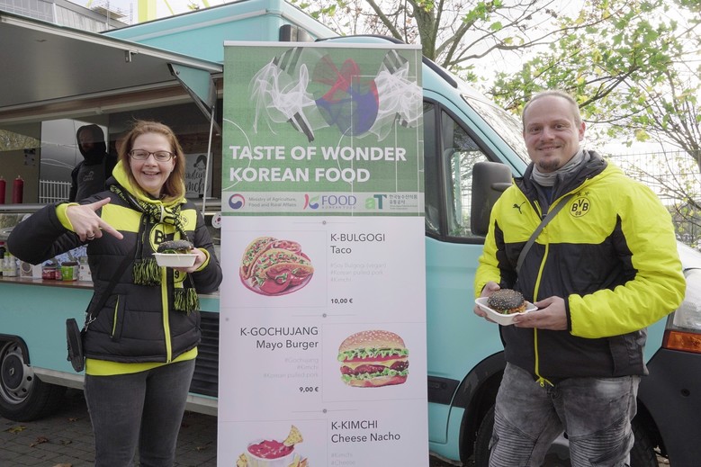 공사는 분데스리가의 인기 클럽 ‘도르트문트 BVB’ 홈구장에 푸드트럭을 설치하고 고추장 마요 버거, 김치 치즈 나쵸, 간장 불고기 타코 등 한국 대표 식품과 현지 음식을 조화롭게 곁들인 퓨전 스낵을 선보여 현지 축구 팬들의 뜨거운 호평을 얻었다.