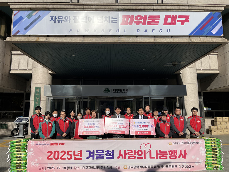▸ 기부문화 확산 및 복지 향상을 위한 지속적인 노력 다짐 [세계타임즈=대구 한윤석 기자] 대구광역시는 12월 18일(목), 시청 동인청사 현관에서 ‘2025년 겨울철 사랑의 나눔행사’를 진행했다.