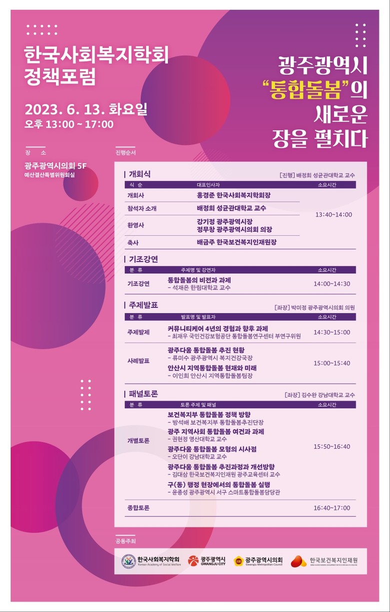 광주광역시청·한국사회복지학회·한국보건복지인재원과 공동주최(4개기관) 하는 이번 포럼은 돌봄 사각지대를 해소하고 촘촘한 돌봄망을 구축하고자 전국 최초로 시행된‘광주다움 통합돌봄’을 공유하고 향후 국가 돌봄 정책의 새로운 비전 제시를 위해 마련됐다.
