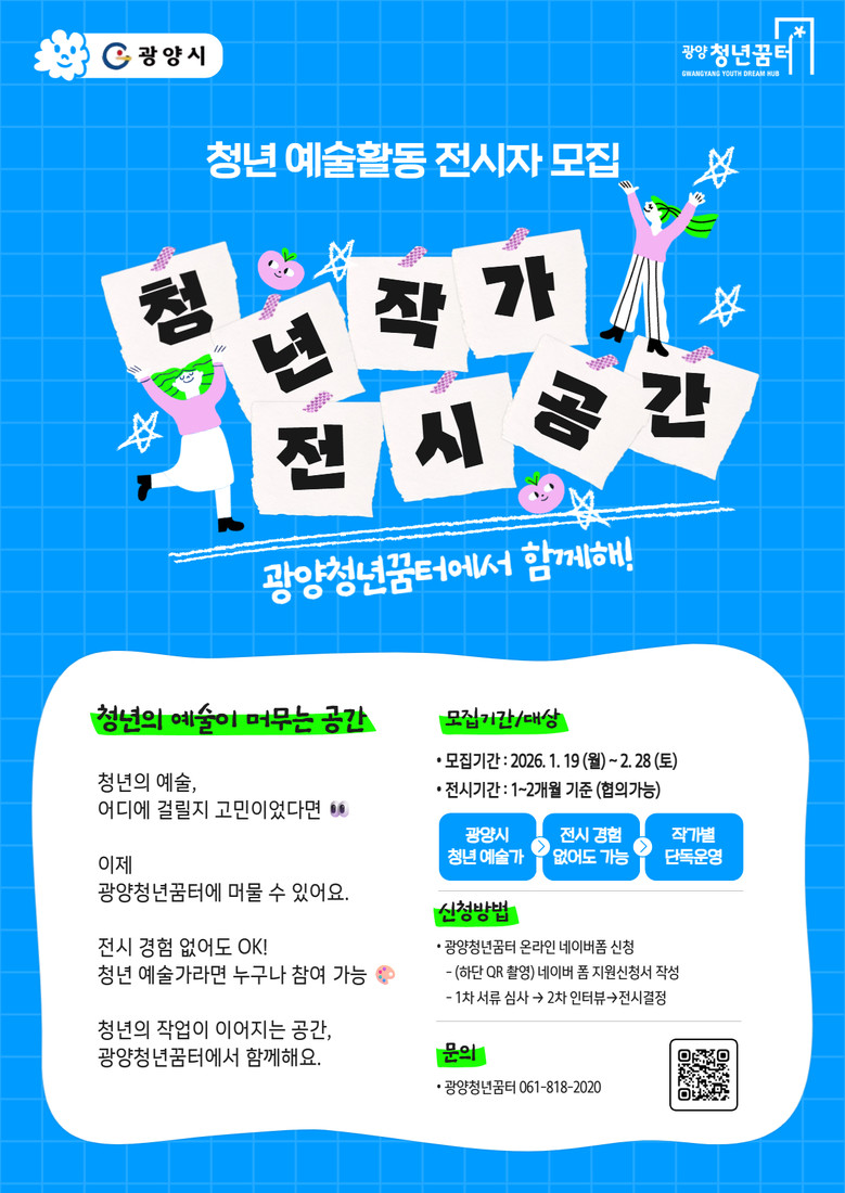 작품 전시를 희망하는 청년은 광양청년꿈터 누리집 및 누리 소통망(SNS)을 통해 관련 내용을 확인하거나, 광양청년꿈터(☎061-818-2020)로 문의하면 된다.