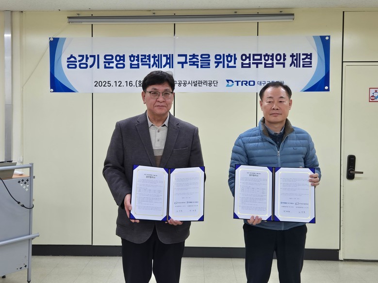▸ 기관 간 정보·기술 공유로 안전한 보행 환경 조성 [세계타임즈=대구 한윤석 기자] 대구공공시설관리공단(이사장 문기봉)은 12월 16일(화) 대구교통공사와 지하도상가 및 지하철역사 내 승강기 운영 협력체계 구축을 위한 업무협약을 체결했다.