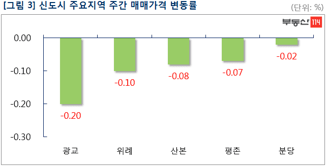 신도시는 ▼광교(-0.20%) ▼위례(-0.10%) ▼산본(-0.08%) ▼평촌(-0.07%) 등이 내림세를 나타냈다. 광교는 급매물이 늘면서 이의동 광교자연앤힐스테이트가 1,000만원 하락했다. 위례는 학암동 위례롯데캐슬이 250만원-2,500만원 떨어졌다.