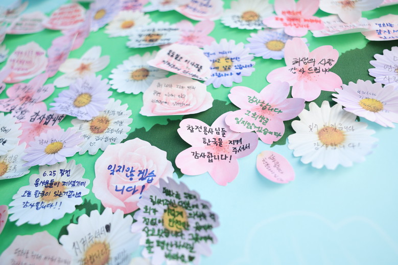 | ▲HWPL 세계평화선언문 제11주년 기념행사가 열린 25일 서울 올림픽공원 평화의광장에 마련된 호국보훈 부스에 6·25 참전용사를 향한 메모지가 붙어있다. |