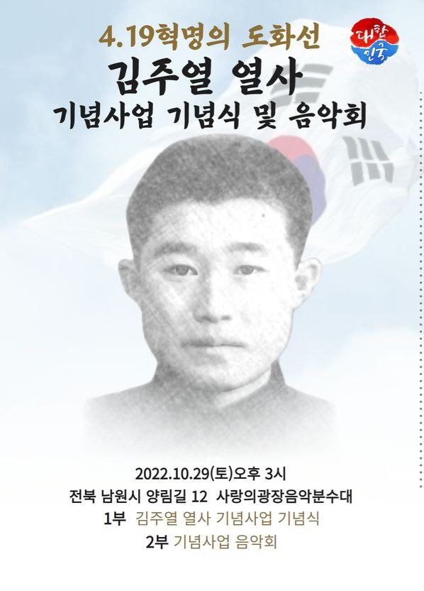 [세계타임즈 백진욱 기자] 제1회 김주열 열사 기념사업 기념식 · 음악회 가 2022년 10월 29일 (토) 오후3시 전북 남원시 양림길에 위치한 사랑의 광장음악분수대 특설무대에서 열린다.