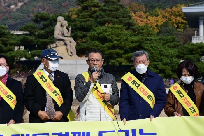 (사진=한국전쟁전후 민간인피학살자 전국유족회와 촛불계승연대가 함께 청와대 앞 마당에서 '올바른 과거사 해결' 촉구 기자회견을 열고 있다, [중앙에 마이크를 쥐고 선 송운학 촛불계승연대 상임대표])