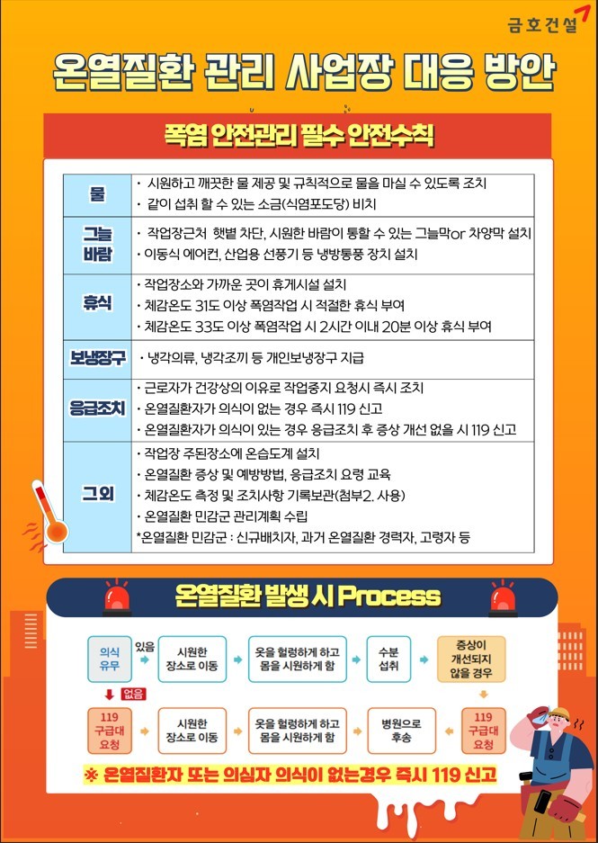 ‘온열질환 ZERO 캠페인’은 ‘전 직원이 함께하는 Safety & Health’라는 슬로건 아래, 전국 모든 현장 근로자 및 협력사 관계자를 대상으로 진행된다. 금호건설의 모든 현장에서 온열질환 예방 교육 실시, 온열질환 예방 물품 지급, 건강 홍보 콘텐츠 제공 등 근로자 건강 보호를 위한 실질적인 활동이 진행된다.