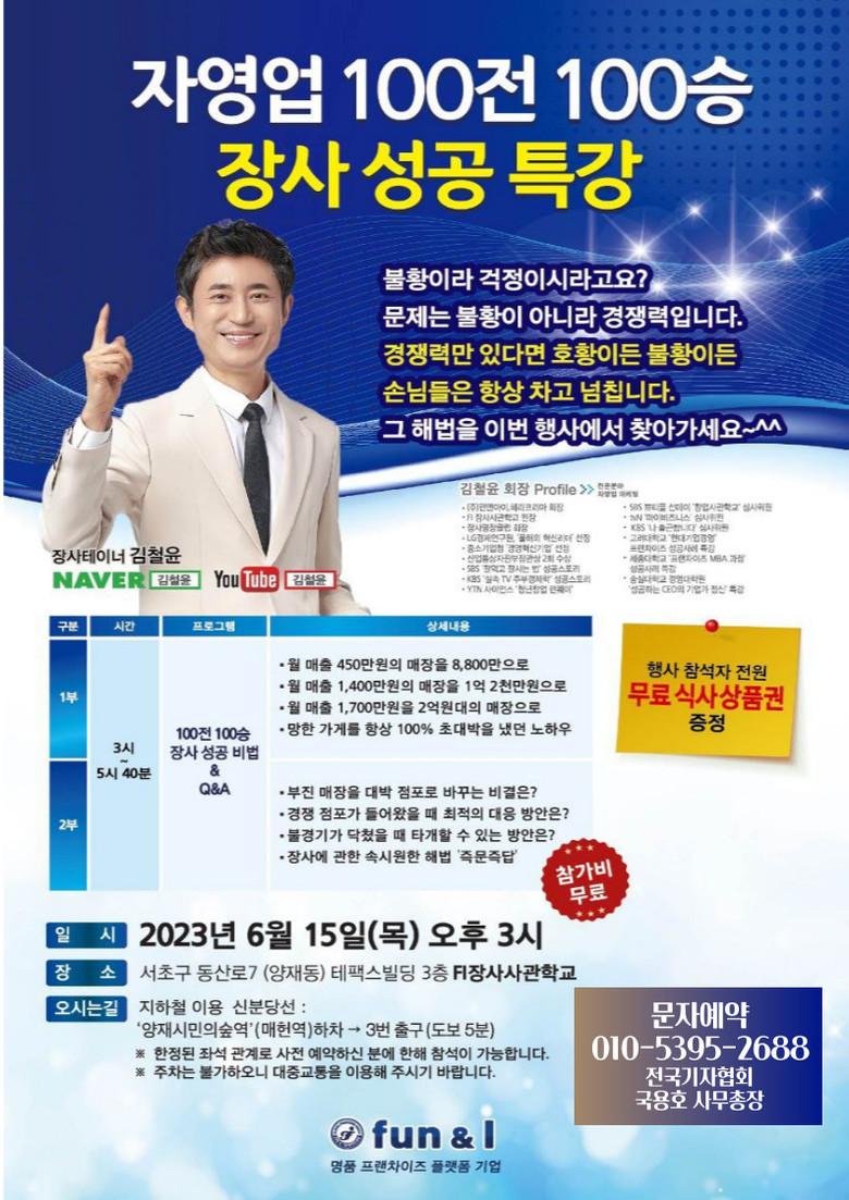 [세계타임즈 백진욱 기자] 6월 15일(목) 오후3시 ㈜펀앤아이 김철윤 회장이 자영업 컨설팅을 주제로 한 “자영업 100전 100승 장사 성공 특강“ 을 서초구 동산로7에 위치한 테팩스빌딩 3층 FI장사사관학교에서 개최한다.