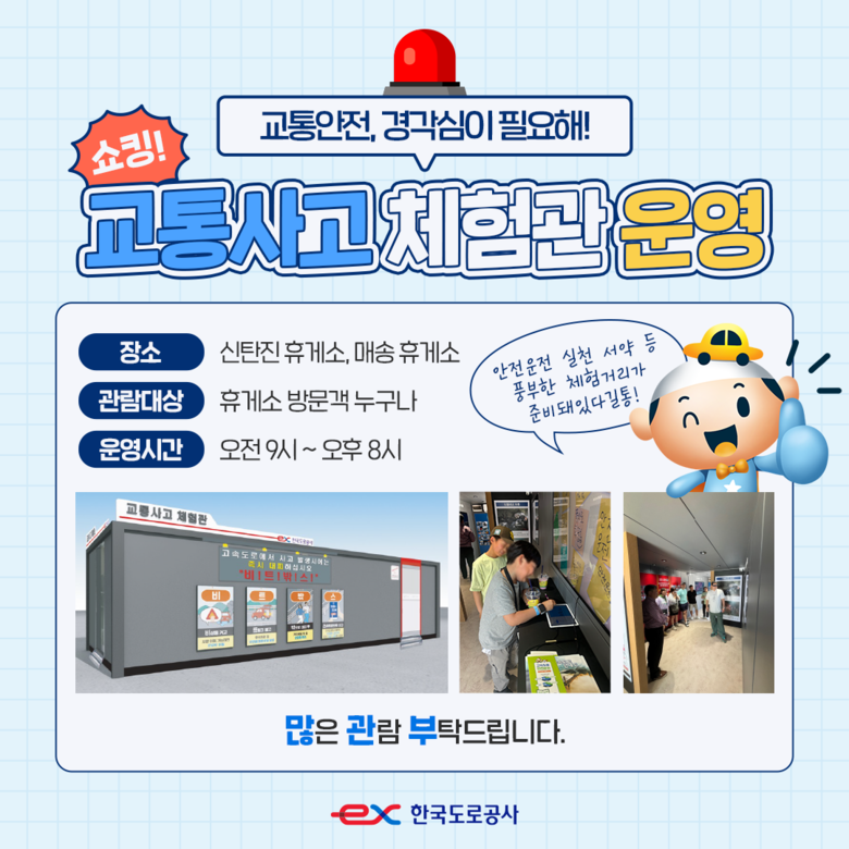 [세계타임즈 = 이영진 기자] 한국도로공사(사장 함진규)는 고속도로 이용객의 안전의식 향상을 위해 경부고속도로 신탄진휴게소(서울방향)와 서해안고속도로 매송휴게소(목포방향)에 ‘교통사고 체험관’을 운영한다고 밝혔다.