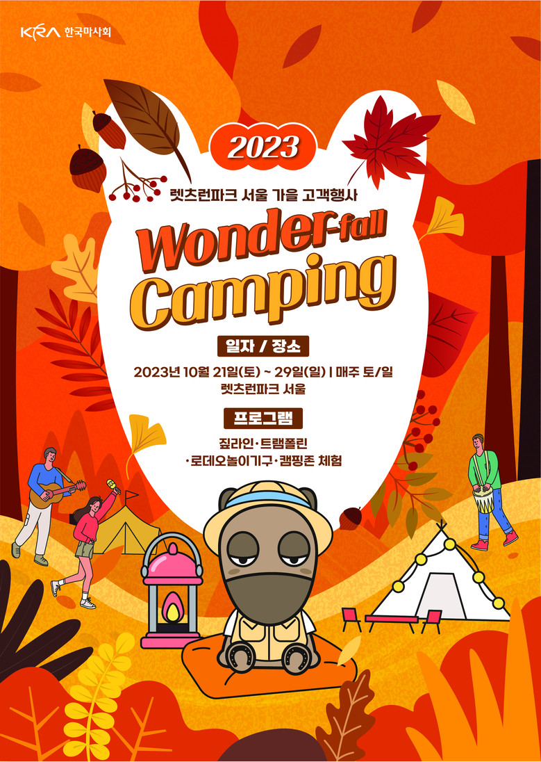 [세계타임즈 = 송민수 기자] 한국마사회 렛츠런파크 서울은 가을을 맞아 오는 21일(토)부터 29일(일)까지 매주 토, 일요일 양일간 ‘원더폴(Wonder-fall)’ 캠핑 축제를 개최한다고 밝혔다. 이번 가을축제는 특히 어린이들의 동심을 가을로 물들여줄 다양한 콘텐츠로 가득하다.