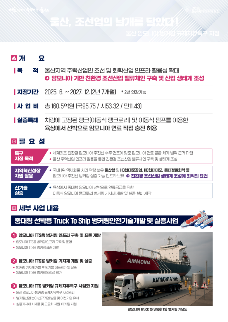 ‘울산 암모니아 벙커링 규제자유특구’는 차량에 고정된 이동식 탱크로리를 이용해 중대형 선박에 암모니아 연료를 안전하게 공급하는 기술·기자재 개발 및 실증하는 사업이다.
