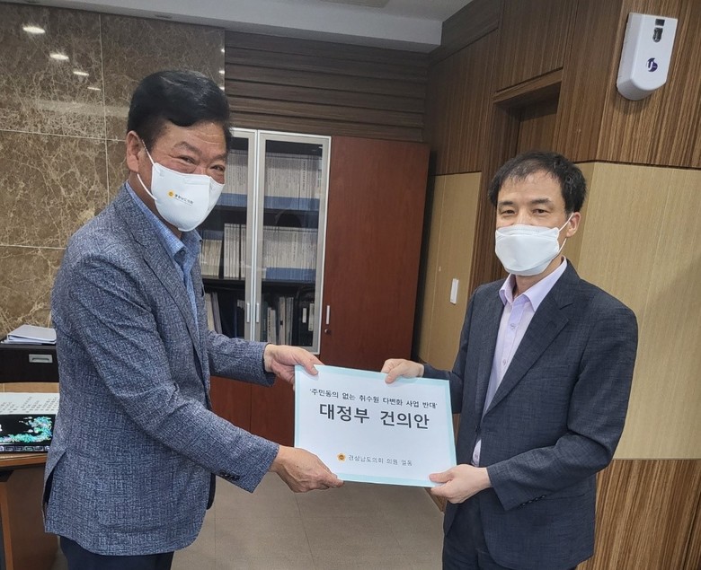 이 자리에서 지난달 26일 경상남도의회 본회의에서 만장일치로 의결한‘주민동의 없는 취수원 다변화 사업 반대 대정부 건의문’과 함께 취수지역 주민들의 입장을 낙동강유역환경청에 전달하였다.