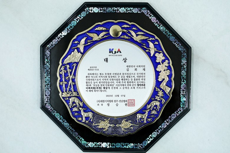 대한기자협회 광주전남협회는 김 의원이 “ 평소 투철한 사명감과 봉사정신으로 국가발전 뿐만 아니라 지역사회 발전에도 큰 공을 세웠으며 , 대한민국 국회의원으로서 지역의 숙원사업을 해결하는 등 훌륭한 의정활동을 높이 평가 받았다 ” 면서 시상 이유를 밝혔다 .