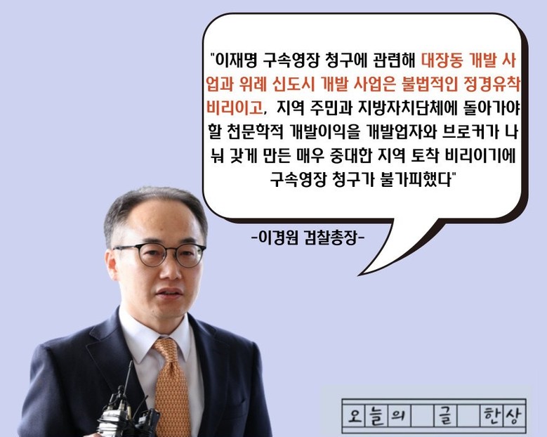 [세계타임즈 백진욱 기자] 지난 16일 이원석 검찰총장이 이재명 더불어민주당 대표에 대한 구속영장 청구와 관련해 "대장동 개발 사업과 위례 신도시 개발 사업은 지방정권과 부동산개발 사업자 간의 불법적인 정경유착 비리이고, 원래는 지역 주민과 지방자치단체에 돌아가야 할 천문학적 개발이익을 개발업자와 브로커가 나눠 갖게 만든 매우 중대한 지역 토착 비리"라면서 "때문에 구속영장 청구가 불가피했다"고 밝혔다.