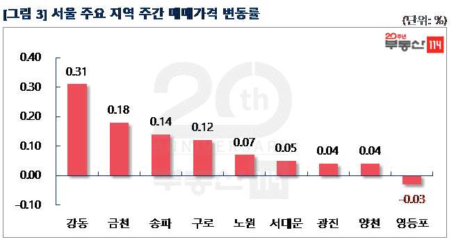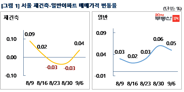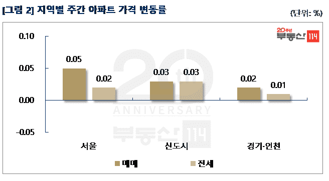 부동산114(www.r114.com)에 따르면 금주 서울 아파트 가격은 0.05% 올라 지난주와 동일한 변동률을 기록했다. 재건축이 0.04% 오르면서 3주만에 상승 전환했고, 일반 아파트는 0.05% 올랐다. 신도시와 경기ㆍ인천은 각각 0.03%, 0.02% 올랐다.