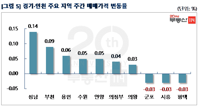 경기ㆍ인천은 △성남(0.14%) △부천(0.09%) △용인(0.06%) △수원(0.05%) △안양(0.05%) △의정부(0.04%) 등이 올랐다. 성남은 주변 재개발 호재로 중앙동 중앙동힐스테이트1·2차가 500만원 올랐다. 부천은 상동 다정한마을쌍용, 동남이 1,000만원-1,200만원 올랐다. 용인은 입주연차가 짧은 구갈동 힐스테이트기흥, 기흥역지웰푸르지오, 역북동 골드클래스용인역북이 1,000만원-1,500만원 상승했다. 반면 입주물량이 많은 ▼평택(-0.03%) ▼시흥(-0.03%) 등은 하락했다. 평택은 이충동 LIG건영과 서정동 금호타운이 450만원-1,000만원 떨어졌고, 시흥은 신천동 경남아너스빌, 휴먼시아가 250만원-1,000만원 하향 조정됐다.