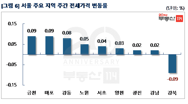 서울 전세가격은 가을 이사철을 맞아 △금천(0.09%) △마포(0.09%) △강동(0.08%) △노원(0.05%) △서초(0.04%) △양천(0.03%) 순으로 올랐다. 직주근접 실수요의 거래가 이어지면서 금천은 가산동 두산위브가 250만원-750만원 올랐고, 마포는 공덕동 래미안공덕1차와 상암동 월드컵파크2단지가 1,000만원-4,000만원 올랐다. 강동은 고덕동 고덕래미안힐스테이트와 명일동 삼익그린2차가 1,500만원-2,000만원 올랐다. 노원은 중계동 중앙하이츠, 양지대림2차, 한화꿈에그린 등이 500만원-2,000만원, 서초는 반포동 반포자이가 2,500만원 상승했다. 양천은 신정동 목동파크자이와 목동신시가지9단지가 500만원-1,000만원 올랐다. 반면 ▼강북(-0.09%)은 번동 솔그린, 해모로가 500만원-1,000만원 하락했다.