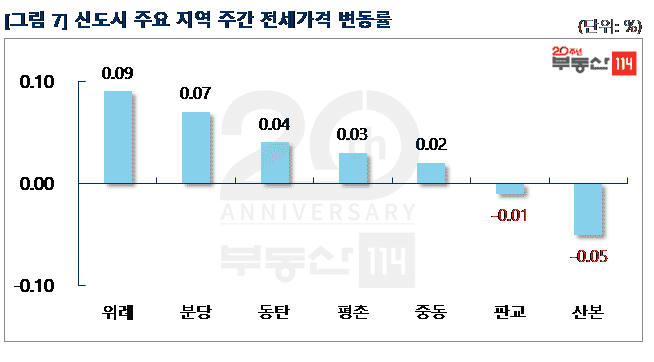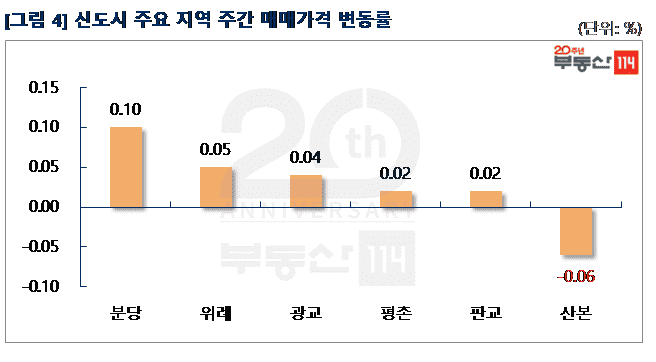 신도시는 △분당(0.10%) △위례(0.05%) △광교(0.04%) △평촌(0.02%) △판교(0.02%)가 올랐고 ▼산본(-0.06%)은 하락했다. 분당은 정자동 정든동아, 분당동 장안건영, 서현동 시범삼성·한신 등이 500만원-2,000만원 올랐다. 위례는 창곡동 위례센트럴푸르지오가 250만원-500만원 상승했다. 광교는 실수요자들의 거래가 간간히 이어진 원천동 광교호반베르디움이 250만원-500만원 올랐다. 판교는 판교동 판교원마을7단지가 소형 위주로 거래된 후 500만원 올랐다. 반면 산본은 거래절벽으로 산본동 가야5단지주공1차가 500만원 떨어졌다.