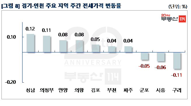 경기ㆍ인천은 △성남(0.12%) △의정부(0.11%) △안양(0.08%) △의왕(0.08%) △김포(0.05%) △부천(0.04%)등이 올랐다. 성남은 전세물건 부족으로 은행동 현대, 두산위브가 500만원 올랐다. 안양은 새 아파트 수요 증가로 호계동 평촌더샵아이파크가 500만원-1,000만원 상승했다. 의왕은 내손동 일대 대단지 아파트인 포일자이와 의왕내손e편한세상이 500만원 상승했다. 반면 ▼구리(-0.11%) ▼시흥(-0.06%) ▼군포(-0.05%) 등은 떨어졌다. 구리는 인근 다산신도시의 입주 여파로 인창동 구리더샵그린포레1단지와 갈매동 갈매역IPARK가 500만원 하향 조정됐다. 시흥은 올 상반기 배곧신도시에 입주에 이어 9월 장현동과 대야동에 1,300여 가구가 들어서면서 정왕동 계룡1차가 500만원-2,000만원 떨어졌다.