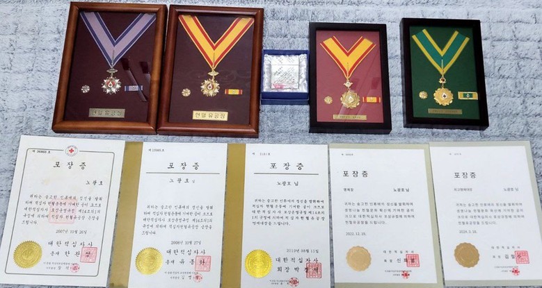 | ▲ 노광호 씨가 대한적십자사로부터 받은 포장증 모음 [사진 제공 = 신천지 광명교회] |