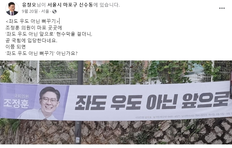 또한 지난 9월 20일에도 조정훈 의원의 ‘좌도 우도 아닌 앞으로’ 현수막을 올리며 국힘 입당에 대해 ‘좌도 우도 아닌 뻐꾸기’라며 글을 올렸다.