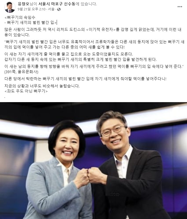 이와 함께 유 감사는 “리처드 도킨스의 <이기적 유전자>를 읽었는데 이 새는 남의 둥지를 향해 방향을 바꿔 자기 새끼에게 주려고 했던 먹이를 뻐꾸기의 입 속에다 넣어 준다”며 “다른 당에서 탁란하는 뻐꾸기 새끼의 벌린 빨간 입에 자기 새끼에게 줘야할 먹이를 넣어주다니”, “좌도 우도 아닌 뻐꾸기”라며 조정훈 의원을 빗대어 공격했다.
