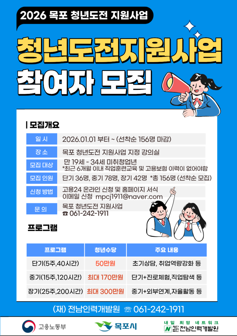 모집은 예산 소진 시까지 선착순으로 진행되며, 신청은 고용24 홈페이지 또는 이메일(mpcj1911@naver.com)을 통해 가능하다. 사업 관련 자세한 사항은 목포 청년도전 지원사업팀(☎ 061-242-1911)으로 문의하면 된다.