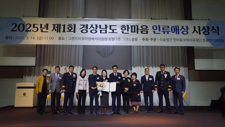 [세계타임즈]최성룡기자 = 창원한마음병원(이사장 최경화)은 그랜드 머큐어 앰배서더 창원호텔에서 ‘제1회 경상남도 한마음 인류애상’ 시상식을 14일 개최했다고 밝혔다. 올해 처음 시행된 한마음 인류애상은 경남에서 나눔과 배려를 실천하며 우리 사회를 더욱 따뜻하게 만들어온 이들을 발굴하고 격려하기 위해 제정됐다.