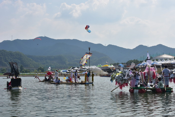 2018 동강뗏목축제의 하이라이트인 동강퓨전뗏목만들기대회 2일차 경기에 참가한 뗏목들이 경주대결을 펼치고 있다.