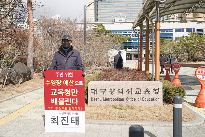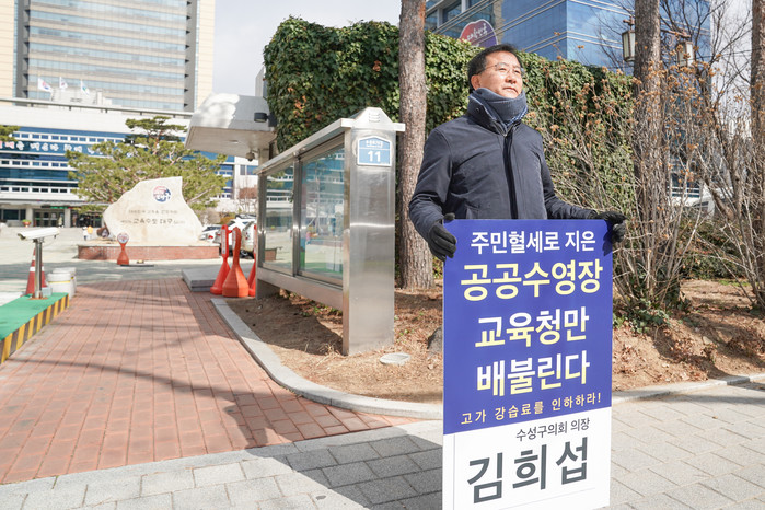 김희섭 의장은 “대구시와 수성구의 예산을 지원받아 건립된 시설인 만큼 그 혜택을 주민들이 누려야 한다.”라며 “이번 릴레이 1인 시위를 통해 대구시 교육청에 수영장 강습료 인하에 대한 의지를 강하게 표명하고 적극적인 해결책 제시를 요구할 것이다.”라고 말했다.