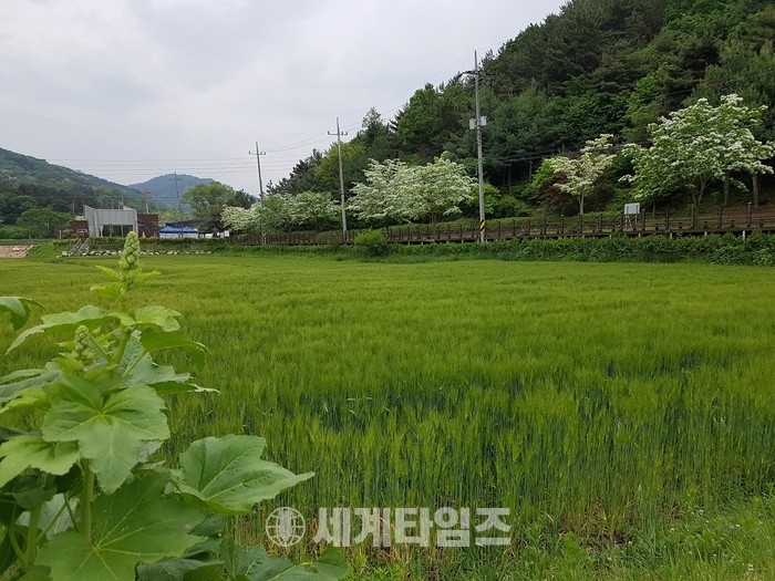 대덕구 장동 계족산 인근 4ha에 걸쳐 지난해에 이어 올해에도 청보리가 무성하게 익어가고 있어 눈길을 끌고 있다.