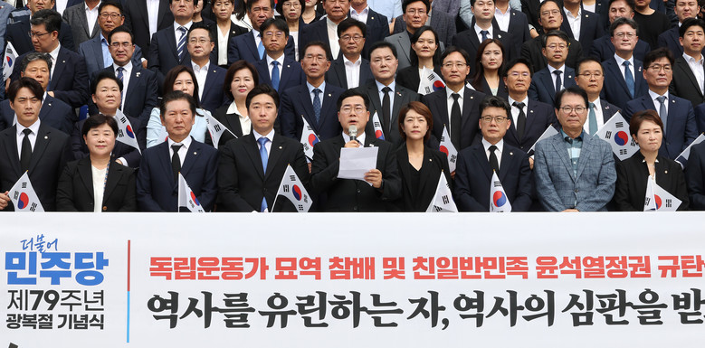 [세계타임즈 = 심귀영 기자] 더불어민주당 등 야당은 광복절인 15일 김형석 독립기념관장 임명 논란을 고리로 친일 정권 프레임을 거듭 부각하며 공세에 나섰다.민주당 박찬대 원내대표는 서울 용산구 백범김구기념관 앞에서 발표한 친일·반민족 윤석열 정권 규탄 성명에서 윤석열 정권은 나라를 통째로 일본과 친일 뉴라이트에 넘기려는 음모를 당장 중단하고 국민과 순국 선열에게 사죄하라고 요구했다.당내 윤석열 정권 역사 쿠데타 저지 태스크포스(TF)를 구성하겠다면서 시민사회와 함께 범국민적 저항운동도 전개할 것이라고 밝혔다.광복회 등이 주관한 경축식에 참석한 박 원내대표는 윤석열 대통령이 정부 주최 경축사에서 반자유·반통일 세력을 언급한 데 대해 아직도 통치 이념을 잘못된 이념에만 국한해 철저하게 편 가르고 있다라고도 지적했다.박 원내대표는 기자들과 만나 김 관장 임명에 대해 애국 보수단체들도 반대하는 상황이라며 윤 대통령이 이렇게 국민을 분열시키고 역사의식을 갖지 못한다면 대통령 자격이 없다고 주장했다.최민석 대변인은 국회 소통관 브리핑에서 윤석열 정권은 친일의 역사를 복권하기 위해 광복절 79주년마저 친일 부활절로 만들어버렸다며 민주당은 김 관장 임명 철회를 위해 광복회 등 관련 단체와 연대하겠다고 밝혔다.조국혁신당 조국 대표는 서울 광화문광장에서 연 기자회견에서 윤 대통령은 대한민국 20대 대통령인가, 아니면 조선총독부 제10대 총독인가라고 비난했다.조 대표는 윤 대통령을 일제 밀정 같은 자들을 요직에 임명한 왕초 밀정이라고 규정하며 친일 밀정 정권 축출에 온 힘을 다하겠다고 강조했다.
