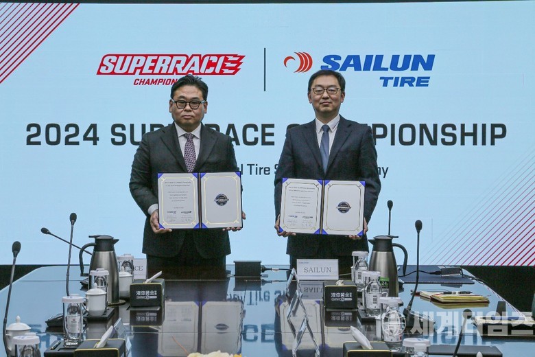 [세계타임즈=방춘재 기자] 슈퍼레이스 챔피언십이 2년 연속 사일룬 타이어와 함께 한다. 슈퍼레이스와 사일룬 타이어는 18일 중국 산둥성칭다오시에 위치한 사일룬 타이어 본사에서 2024년도 GT 클래스 오피셜 타이어 서플라이어 스폰서십 조인식을 진행했다. 올 시즌에 이어 내년 시즌에도 GT 클래스 전 차량은 사일룬 타이어를 장착하고 달린다.