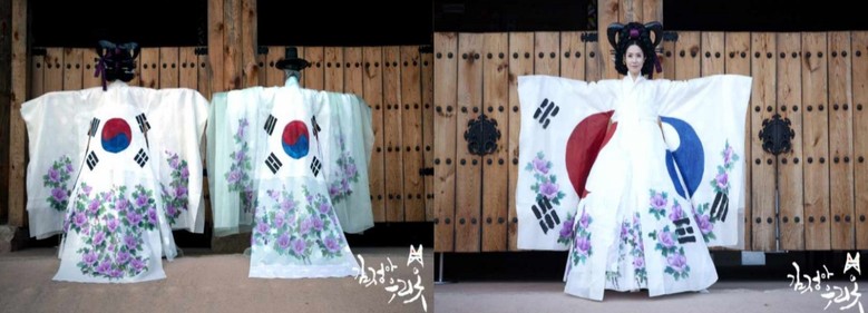 ▲김정아 디자이너(왼쪽)과 무궁화 한복(오른쪽)