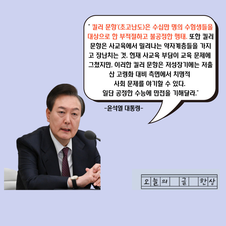 대통령실 관계자는 19일 "이 킬러 문항은 수험생들에게는 부적절하고 불공정한 행태"라며 윤 대통령이 이같이 말했다고 전하며 이번 수능에 킬러 문항을 출제 배재할 방향이라고 밝혔다.