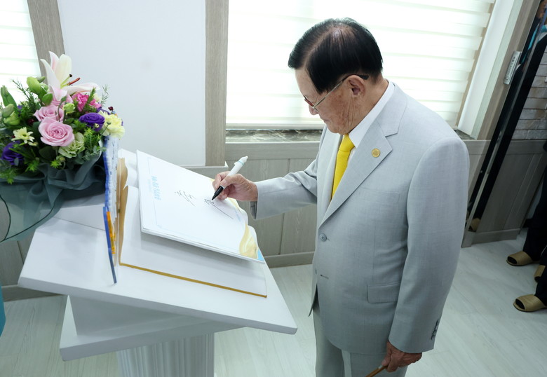 13일 신천지예수교회 안드레지파 창원교회를 방문한 이만희 총회장이 축하 메시지를 적고 있다.