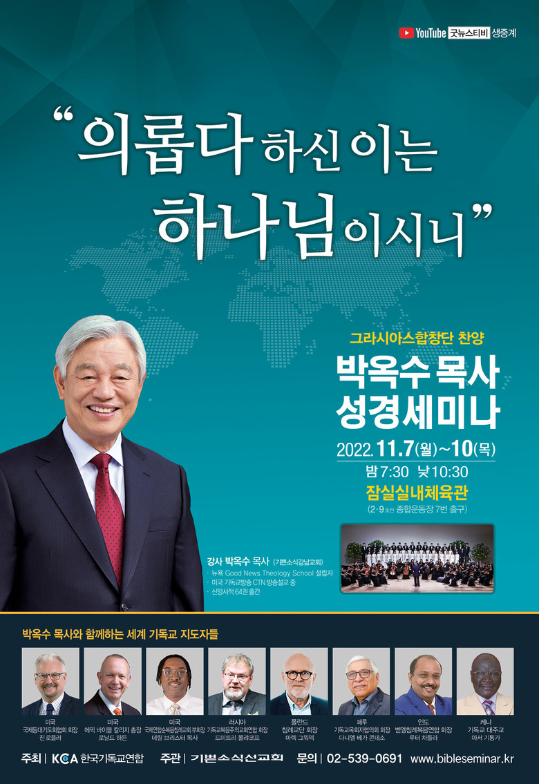 이번 성경세미나는 유튜브 채널 ‘GoodNewsTV’, ‘GoodNewsTV global’에서 영어, 불어, 스페인어, 중국어, 러시어어 등 5개 언어로 통역돼 생중계된다. 자세한 사항은 ‘박옥수 목사 성경세미나’ 공식 홈페이지(www.bibleseminar.kr)에서 확인할 수 있다.