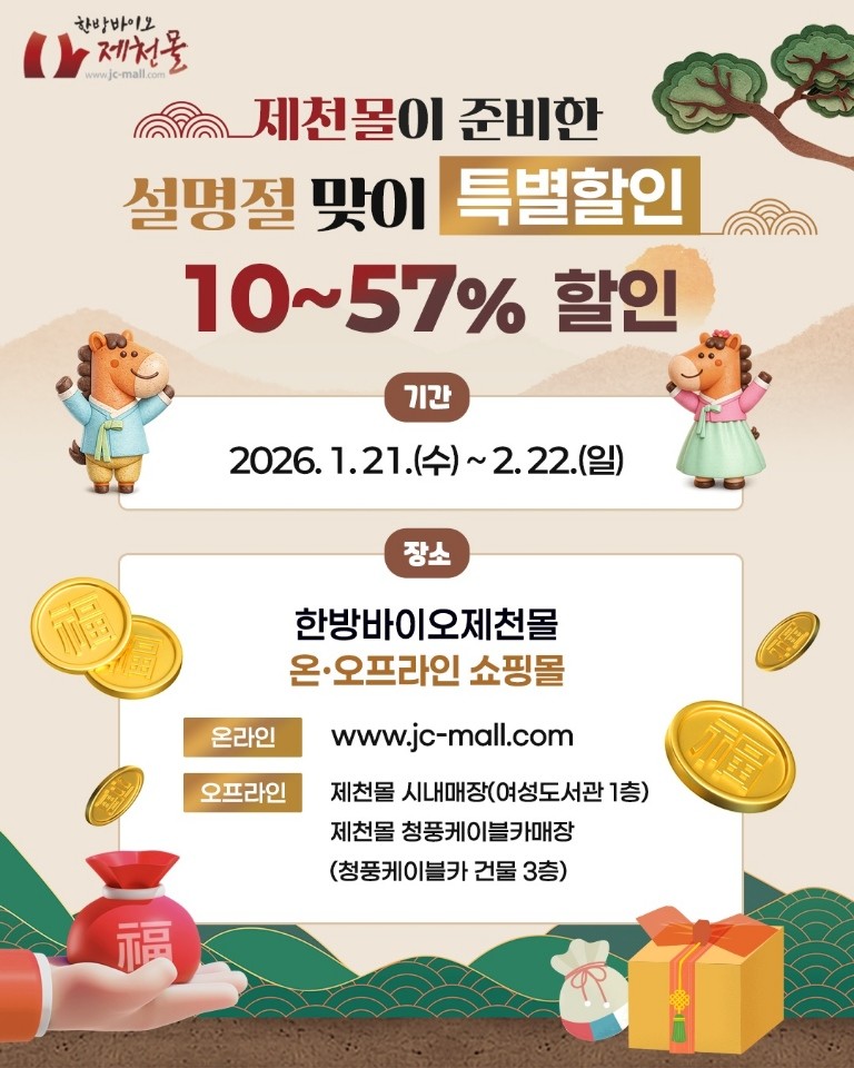재단 관계자는 “이번 판촉 행사는 제천의 우수한 한방 제품을 합리적인 가격에 만나볼 수 있는 좋은 기회”라며 “설 명절을 맞아 많은 분들이 제천몰을 통해 건강한 선물을 준비하길 바란다”라고 말했다.