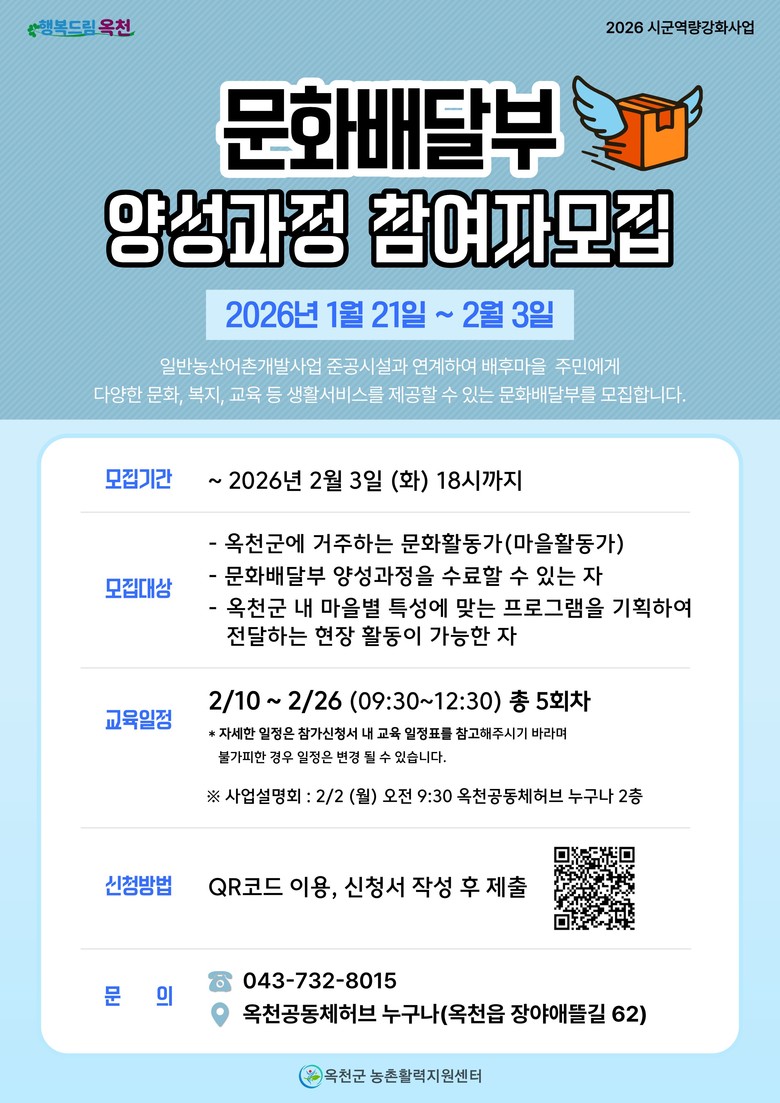 교육 대상은 옥천군에 거주하는 문화활동가(마을활동가)이며, 교육은 2월 10일부터 26일까지 총 5회에 걸쳐 진행된다. 주요 내용은 ▲문화배달부에 대한 이해 ▲강의 스킬업 과정 Ⅰ·Ⅱ ▲프로그램 발표 및 시연 등으로 구성된다.