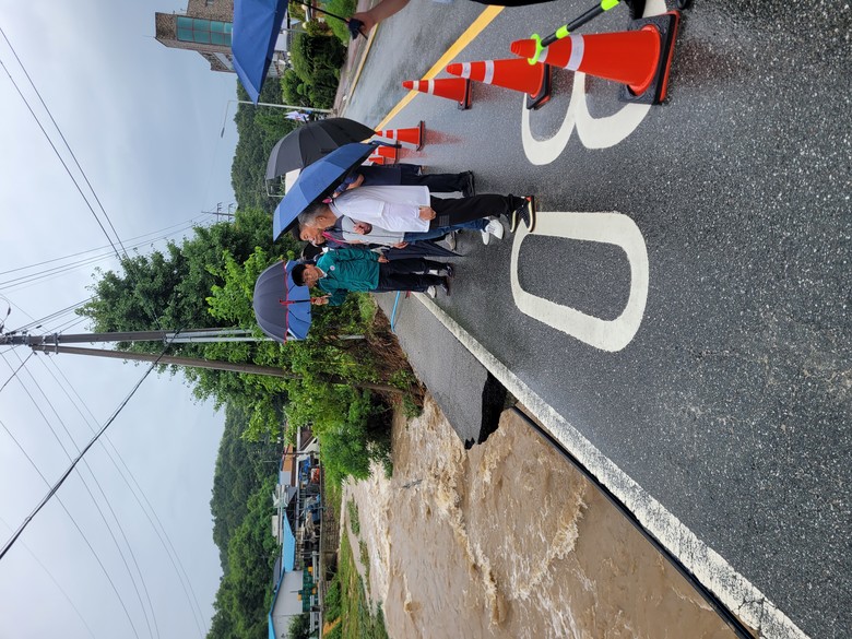 이양섭 의장은 먼저, 청주시 내수읍 덕암리 도로 유실 현장을 변종오 의원과 함께 방문해 복구 진행 상황을 점검하고, 주민 및 관계 공무원들의 노고를 격려했다.